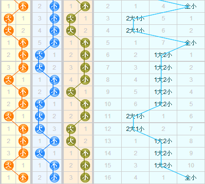 根据近期的大小走势来分析,近期总体上来说是小号出号强势。上期又开出了全小组合,近期需防大号开出。百位上小号走势走强,结合走势,本期百位上看好大号。十位上上期开出小号1,连续两期开出小号,根据走势,本期可关注大号。个位上小号连续开出了小号,近期需防大号开出。结合大小走势,本期大小推荐:小大大、大小大,防大大大。