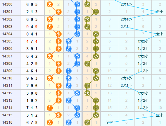 上期大小形态开出大大大,根据以往的大小走势分布,大小形态全打开出后悔间隔几期才会开出,本期不可能再开出全大。本期看好2大1小大小形态的开出。观察百十个位上大小的分布,百位上开出大号求的概率较大,十位上开出小号球,个位上开出大号球。本期综合推荐大小大防小大大。