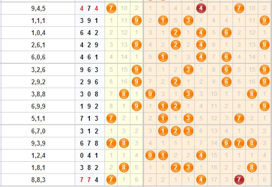 通过上面的福彩3D综合走势图可以看出,上期开出的774,开出了组三形态,上期开出的号码中7号是热号,4号是冷号,本期的话可以继续关注2个热号1个冷号的开出,尤其是冷号5的开出。
