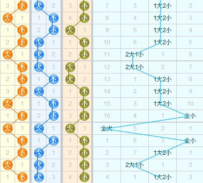 根据近期的大小走势来分析,近期总体上来说是小号出号强势,上期有开出了1大2小组合。在近15期中1大2小组合开出了9期,本期仍可继续关注。百位上小号走势强势,上期开出了小号1,本期可关注大号。十位上近期是大号走势较强一些,上期开出了大号8,连续三期开出了大号,本期十位看好小号。个位上小号走势强势,已经连续四期开出了小号,本期有望继续开出小号。结合走势,本期大小形态推荐:大大小、小小大、大小大、大小小。
