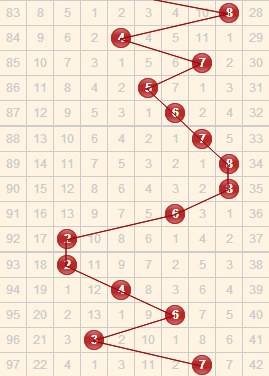 上期开出了大跨度7,从近5期开出的跨度2-4-6-2-7来看,近期开出的跨度呈现出来回曲折的走势,结合走势本期可重点关注4-8的跨度。而大跨度9已经有42期没有开出了,本期也可关注一下,它与之前的开出的跨度呈现依次上升的走势,也值得关注。本期苏会文跨度推荐:4、5、8、9