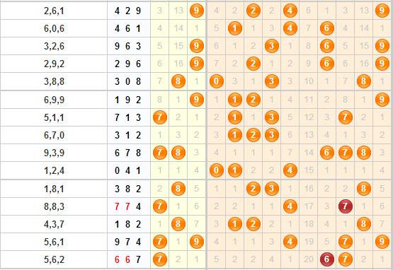 和值趋势分析:上期的和值是19,跟上上期只隔了1期,本期的话和值会往下走,预计会开在和值14也就是水平线附近位置上,重点关注11-17之间的和数点。