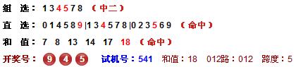 上期开奖号是945,1大2小形态,跨度为5,和值是18,类型为组六,012路为012。