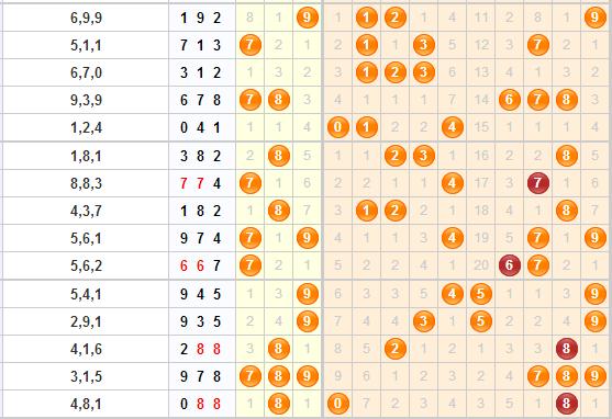 通过上面的福彩3D综合走势图可以看出,上期开出的088,其中0号球是近10期中的冷号,8号球是近10期中的热号,也就是说开出了1冷1热的状态,本期的话冷号球关注1码,热号球关注7码。
