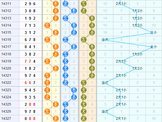 上期大小形态开出小大大,本期可以关注2大1小的形态。百位上近期开出的大小走势为小-大-小,本期看好小号球的开出;十位上已经连续3期开出大号球,本期依然看好大号球的开出;个位上已经连续6期开出大号球,本期看好小号球的开出,本期综合推荐小大小。
