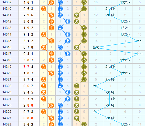 上期大小形态开出小大小,本期可以关注1大2小的形态。百位上近期开出的大小走势为大-小-小,本期看好小号球的开出;十位上已经连续4期开出大号球,本期依然看好大号球的开出;个位上突破连续开出6期大号球的现象,上期看出了小号球,本期看好小号球的开出,本期综合推荐小大小防全小。