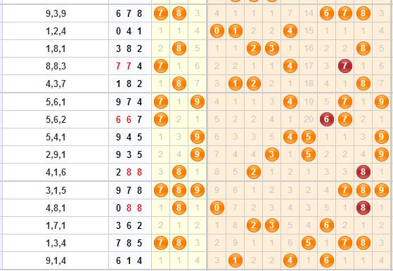 和值趋势分析:上期开出了11,和值11只隔了1期就又开出来了,近期的话,和值会趋向于中间和值,重点关注11-17之间的和值。