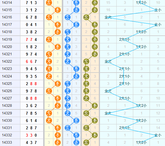 上期大小形态开出小小大,本期可以关注1大2小的形态。百位上银镜连续3期开出小号球,本期看好小号球的开出;十位上连续两期开出小号球,本期看好小号球的开出;个位上上期开出大号球,本期依然看好大号球的开出。本期综合推荐小小大。