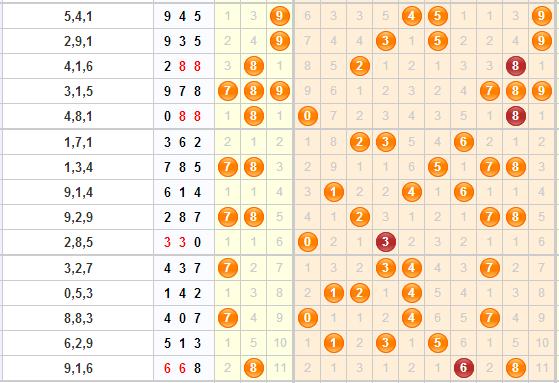 通过上面的福彩3D综合走势图可以看出,上期开出了668,这两个球在近10期中都是偏冷的球,本期的话可以冷热结合,冷球重点关注9号球。