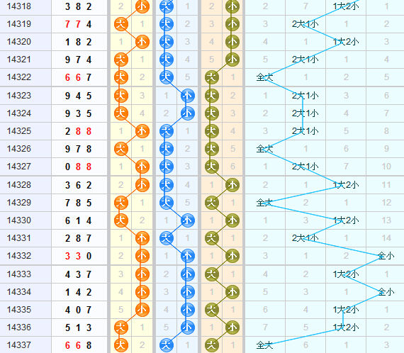 上期大小形态开出全大,本期可以关注2大1小的形态。百位上期开出大号球,本期看好小号球的开出;十位上上期开出大号球,本期看好大号球的开出;个位上看好大号球的开出;本期综合推荐小大大防大小大。