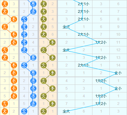 根据近期的大小走势来分析,从总体上来看,近期大小走势还是比较平衡的,15期中开出大号24次小号21次。上期又开出了全大组合,而2大1小组合已经有6期没有开出了,本期可重点关注。结合走势,本期的大小形态推荐:大大小、大小大、小大小。
