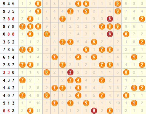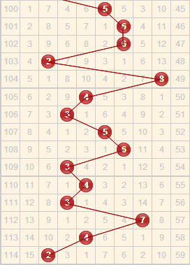 上期开出了小跨度2,从近5期开出的跨度4-3-7-4-2来看,近期开出的跨度主要是集中在3-6之间,但这两期开的跨度均在此跨度之外,那么本期可继续关注次区间两边的跨度。而最近三期开出的跨度依次呈现下降的趋势,本期继续下降的可能性不大。根据走势情况,本期苏会文跨度推荐:2、3、4、8