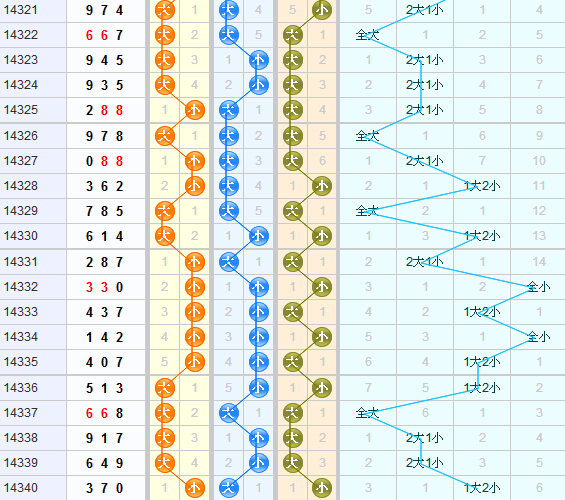 上期大小形态开出小大小,本期可以关注2大1小的形态。百位上期开出小号球,本期看好大号球的开出;十位上上期开出大号球,本期看好大号球的开出;个位上期开出小号球,本期看好小号球的开出,本期综合推荐大大小防全大。