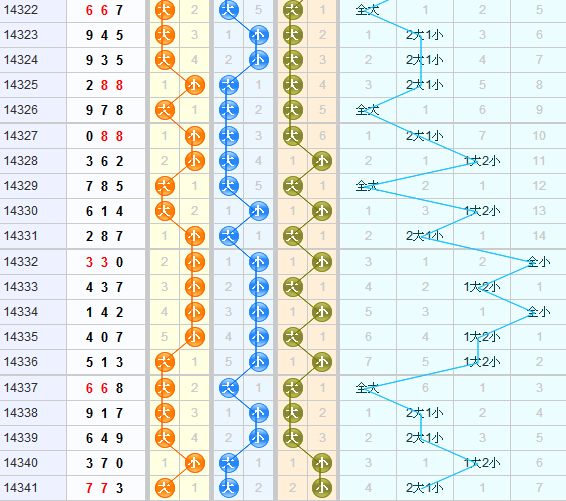 上期大小形态开出大大小,本期可以关注2大1小的形态。百位上期开出大号球,本期看好大号球的开出;十位上期开出大号球,本期看好大号球的开出;个位上期开出小号球,本期看好小号球的开出,本期综合推荐大大小防全小。