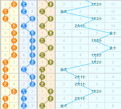 根据近期的大小走势来分析,从总体上来看,近期大小走势还是比较平衡的,15期中开出大号23次小号22次。上期又开出了全大组合,而全小组合已经有8期没有开出,近期可重点关注一下。结合走势,本期的大小形态推荐:小大大、大大小、小小大。