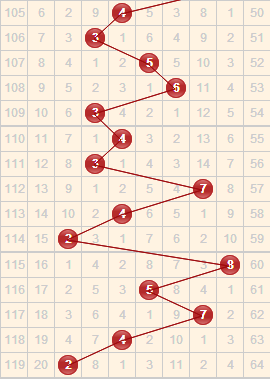 上期开出了小跨度2,从近5期开出的跨度8-5-7-4-2来看,连续三期开出的跨度成下降趋势,预计本期继续下降的可能性不大,所以本期可关注2以上的跨度。而最近的跨度主要是集中在2-7之间,而跨度9已经有64期没有开出了,近期可继续关注。根据走势情况,本期苏会文跨度推荐:3、5、6、8