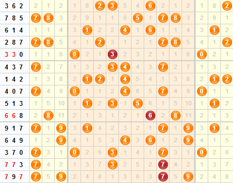 组合分析:昨晚开出的是797,组三组合。上上期刚开出过组三,没想到上期又开出了77*的组三组合,连续两期开出了77*的组三组合,而且7号球还是近期的热号球,所以本期可继续关注。