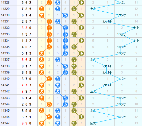 上期大小形态开出大大大,本期可以关注2大1小的形态。百位上期开出大号球,本期看好大号球的开出;十位上期开出大号球,本期看好小号球的开出;个位上期开出大号球,本期看好大号球的开出,本期综合推荐大小大。
