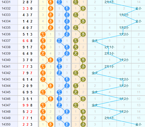 上期大小形态开出全小,本期可以关注1大2小的形态。百位上期开出小号球,本期看好小号球的开出;十位上期开出小号球,本期看好小号球的开出;个位上期开出小号球,本期看好大号球的开出,本期综合推荐小小大。