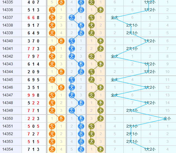 上期大小形态开出大小小,本期可以关注1大2小的形态。百位上期开出大号球,本期看好小号球的开出;十位上期开出小号球,本期看好大号球的开出;个位上期开出小号球,本期看好小号球的开出,本期综合推荐小大小。