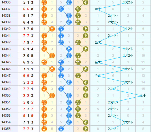 上期大小形态开出大大小,本期可以关注1大2小的形态。百位上期开出大号球,本期看好小号球的开出;十位上期开出大号球,本期看好小号球的开出;个位上期开出小号球,本期看好大号球的开出,本期综合推荐小小大。