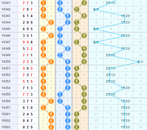 上期大小形态开出小小大,本期可以关注1大2小的形态。百位上期开出小号球,本期看好大号球的开出;十位上期开出小号球,本期看好小号球的开出;个位上期开出大号球,本期看好大号球的开出,本期综合推荐大小大。