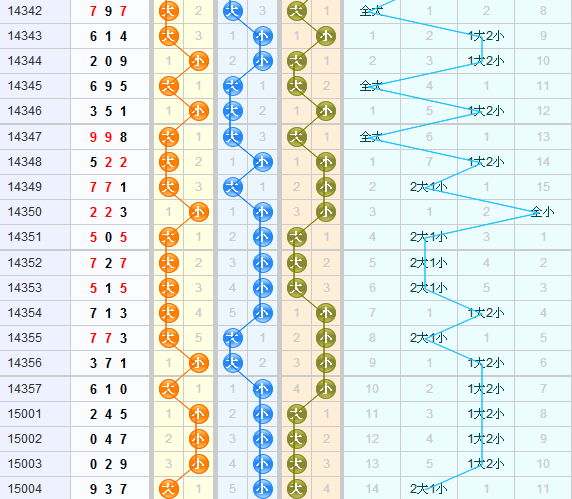 上期大小形态开出大小大,本期可以关注1大2小的形态。百位上期开出大号球,本期看好小号球的开出;十位上期开出小号球,本期看好大号球的开出;个位上期开出大号球,本期看好小号球的开出,本期综合推荐小大小