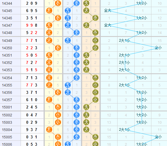 上期大小形态开出小大小,本期可以关注2大1小的形态。百位上期开出小号球,本期看好小号球的开出;十位上期开出大号球,本期看好大号球的开出;个位上期开出小号球,本期看好大号球的开出,本期综合推荐小大大。