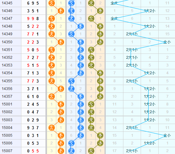 上期大小形态开出小大大,本期可以关注2大1小的形态。百位上期开出小号球,本期看好大号球的开出;十位上期开出大号球,本期看好小号球的开出;个位上期开出大号球,本期看好大号球的开出,本期综合推荐大小大。