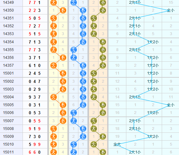 上期大小形态开出大大小,本期可以关注2大1小的形态。百位上期开出大号球,本期看好大号球的开出;十位上期开出大号球,本期看好小号球的开出;个位上期开出小号球,本期看好大号球的开出,本期综合推荐大小大。