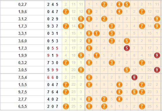 通过上面的福彩3D综合走势图可以看出,上期开出的207,其中0号球跟7号球是近10期中比较热的球,2号球比较冷。