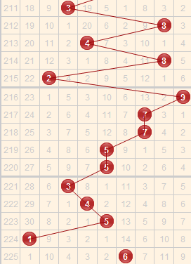 从跨度走势图山看,上期开出的跨度是6,属于大跨度。根据以往走势看,本期的跨度应该集中在3-7区间,本期综合推荐跨度:3,、4、5、6、7