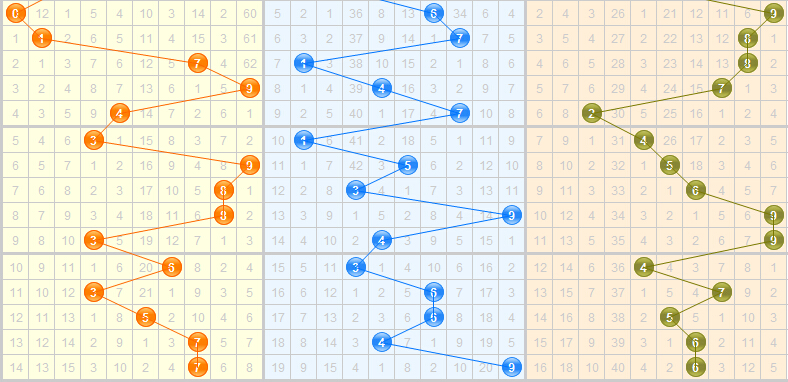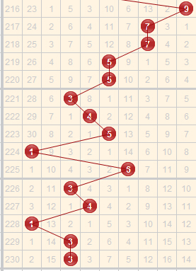 近5期开出的跨度是3-4-1-3-3,上期开出的跨度是3,是一个比较小的跨度,大跨度8已经16期没有开出了,本期可进行防守,近期跨度主要集中在1-6之间,其中的跨度2已经遗漏15期,本期有机会开出,跨度3已经连出2期,结合走势,本期关注跨度1、2、4、8。