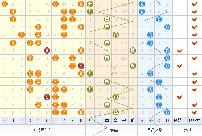 根据类型走势图,上期开出的是组六组合,上上期开出的也是组六,从走势图上看,看好连续开出组六,本期苏会文推荐类型:组六组合。