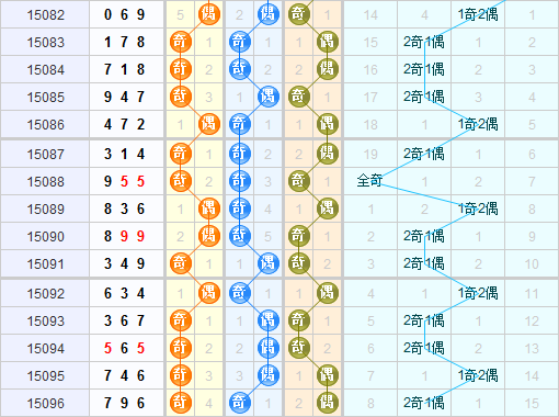 从奇偶走势图来看,上期开出的是奇奇偶,奇偶比为二比一,本期推荐续关注2奇1偶的形态。百位上上期开出的是奇号球,奇号球已经连续开了4期,根据走势图,本期推荐关注偶号球。十位上上期开出的是奇号球,本期推荐关注偶号球。个位上上期开出的是偶号球,根据自己几期偶号球都是连开两期的情况,本期推荐关注奇号球。本期综合推荐关注奇偶形态:偶偶奇