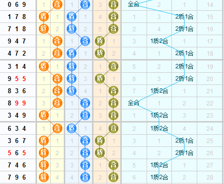 从质合走势图来看,上期开出的是质合合,质合比为一比二,本期推荐关注2质一合的形态。百位上上期开出的是质数,质数已经连续开了4期,本期推荐关注合数。十位上上期开出的是&数球,合号球也连续开了4期,本期推荐关注质号球。个位上上期开出的是合号球,根据走势图分析,本期推荐关注质好球。综合以上本期推荐关注质合形态质合质。