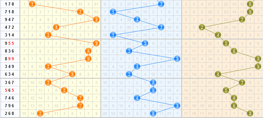 和值分析:最近5期的和值依次是16-16-17-22-16,近5期的和值开的到是比较集中的,而且和值16开出了3期了,近期和值主要都集中在了第二区域,预计本期和值会往下走点,推荐关注和值12-18。