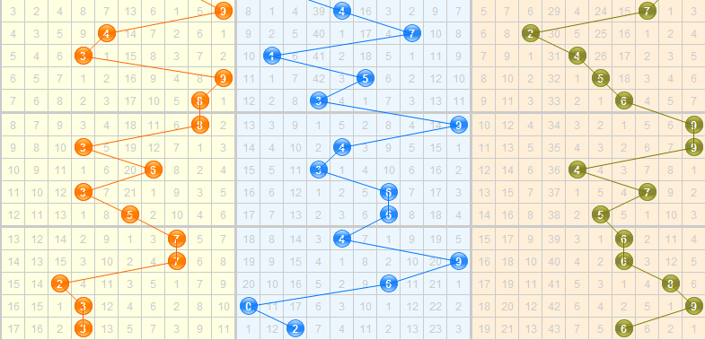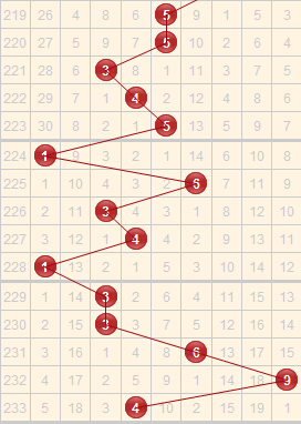 近5期开出的跨度是3-3-6-9-4,上期开出的跨度是3,是一个较中间的跨度,大跨度8和7已经遗漏很多期了,本期可进行防守,近期跨度主要集中在1-6之间,其中的跨度2已经遗漏18期,本期有机会开出,跨度3近期走势较热,结合走势,本期关注跨度2、3、7、8。