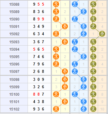 从综合走势图来看,上期开出组六,出奖号为936。综合走势图分析,最近几期0路数字出现的次数较多,推荐关注下0路数字。1号球已经短暂遗漏15期,本期可适当防守1号球。3号球上上期开奖号,最近几期走势比较热拖号情况常常出现,本期看好3号球的开出。4号球是隔期号,还是上期开奖号3号的临码,本期看好3号球的开出。8号球是隔期号,还是上期开奖号9号的临码,看好8号球的开出。另外,6号球的和7号球的走势较热,5号球的走势偏冷。