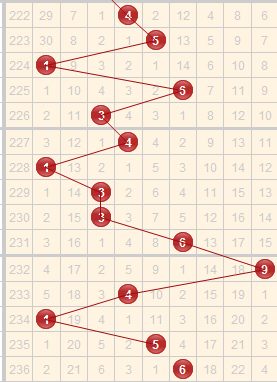 从跨度走势图来看,上期开出的跨度为6,属于大跨度,近几期的跨度在4-6区间,另外最小跨度为1,最大跨度为9。综合分析,本期推荐关注关注跨度:3,4,5,6