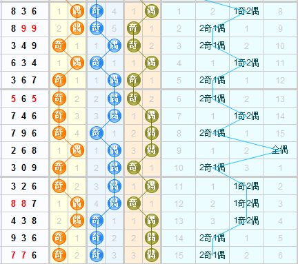 结合3d之家3d奇偶走势图近15期走势来看,上期开出奇奇偶,百位上近期奇偶都是连开两期交换,根据规律,本期看好偶号球。十位近期奇号球连续开了3期,本期看好偶号球的开出。个位上期开出偶数号球,本期个位看好开出奇数号,本期奇偶形态综合推荐:偶偶奇,奇偶奇。