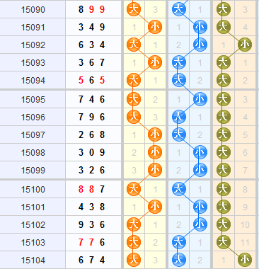 从大小走势图来看,上期开出的是大大小,在近几期大号球走势热些,分析走势图本期推荐关注2小1大的形态。百位上上期开出的是大号球,分析走势图,本期推荐继续关注大号球。十位上上期开出的是大号球,根据走势图上情况,大号球都是两期连开的,本期看好小号球的开出。个位上上期开出的是小号球,大号球大热已经连续开了11期,本期推荐关注小号球的开出。 综合以上本期推荐形态大小小,小大小。