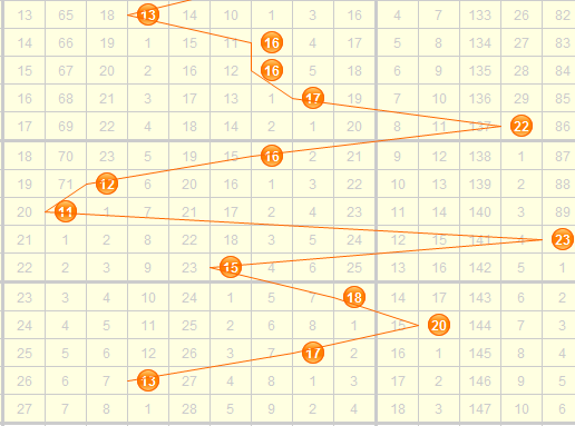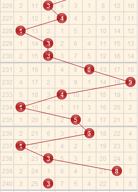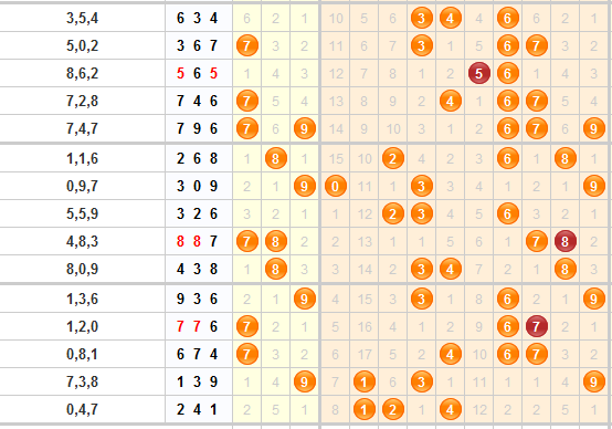 从跨度走势图来看,上期开出的跨度为3,属于小跨度,近几期的跨度分布比较散,最大值9,最小值1.本期预计跨度会向右边走走,综合分析,本期推荐关注关注跨度:3,4,5,6