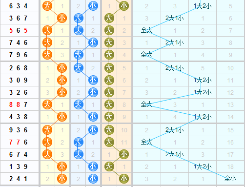 从大小走势图来看,上期开出的是小小小,在近几期大号球走势热些,分析走势图本期推荐关注2小1大的形态。百位上上期开出的是小号球,分析走势图,本期推荐关注大号球的开出。十位上上期开出的是小号球,根据走势图上情况,小号球都是两期连开的,本期看好大号球的开出。个位上上期开出的是小号球,近10期中,大号球开了8期,近几期小号球有回暖的趋势,本期推荐关注小号球的开出。 综合以上本期推荐形态大小小,大大小。