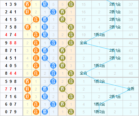 根据质合走势图来看,分析质合比,本期推荐关注2质1合的形态。百位上连续开出2期合号球,根据走势图分析,百位上合号球的走势比较热,本期推荐关注合号球的开出。十位上上期开出的是质号球,质号球近几期没有单开的情况,本期看好质号球的继续开出。个位上上期开的是合号球,近几期质数和合数号都是交替开出的,本期推荐继续关注质号球。综合以上本期推荐形态:合质质,合质合。