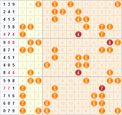 和值趋势分析:上期开出了和值16,开在了第二区域内,近几期和值的集中在13-16区间,本期推荐关注14-20区间内的和值。