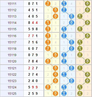 从大小走势图来看,上期开出的是2大1小,近几期小号球的走势比较热一些,分析走势图本期推荐关注2大1小的形态。百位上上期开出的是小号球,前一期开出的是大号球,本期推荐关注大号球的开出。十位上上期开出的是大号球,大号球连续开了两期,前面大小号球是交替开出的,本期推荐关注小号球的开出。个位上上期开出的是大号球,大号球和小号球两期交替开出,本期推荐关注小号球的开出。 综合以上本期推荐形态大小小,小小大。