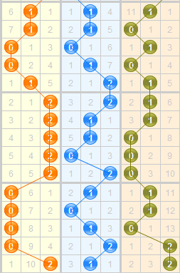 上期012路百位上是2路,近期百位0路明显强势, 1路号码都已经遗漏10期了,本期可进行防守,结合走势图,本期看好转为0路或1路号码开出。十位上从012路走势图上看,1路近期比较强势,上期开出的是1路,结合走势,近期1路都是隔期开,不看好连续开出,本期十位推荐关注0路和2路号码开出。个位上期是2路,2路在遗漏13期之后,已经连续开出2期,本期继续看好开出,结合走势,本期个位推荐关注2路号码开出。