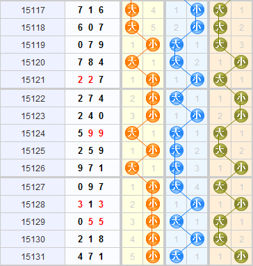 从大小走势图来看,上期开出的是2小1大,近几期小号球的走势稍微热一些,分析走势图本期推荐关注2大1小的形态。百位上上期开出的是小号球,小号球连续开了5期,本期推荐关注大号球的开出。十位上上期开出的是大号球,大小号球是交替开出,本期推荐关注小号球的开出。个位上大号球的走势比较热,上期开出了小号球,本期推荐关注大号球的开出。 综合以上本期推荐形态大小大,小大大。
