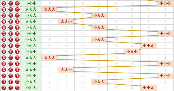 从大小走势图来看,上期开出的是小小大,近几期小号号球的走势稍微热一些,分析走势图本期推荐关注2大1小的形态。百位上上期开出的是小号球,小号球连续开了3期,走势比较热,本期看好小号球的继续开出。十位上上期开出的是小号球,近几期十位上大小号球交替开出,本期推荐关注大号球的开出。个位上上期开出了大号球,近几期大号球连续开了两期,本期推荐继续关注大号球的开出。 综合以上本期推荐形态小大大,大大小。